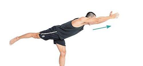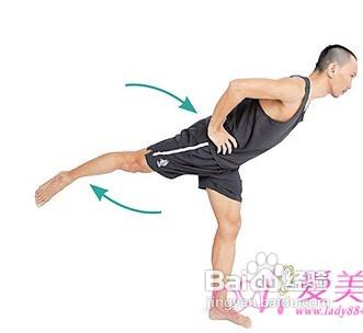 预备动作与初阶版步骤1相同,再双手插腰、重心放在左脚后,右腿伸直往后方抬,并将上半身慢慢往前倾。