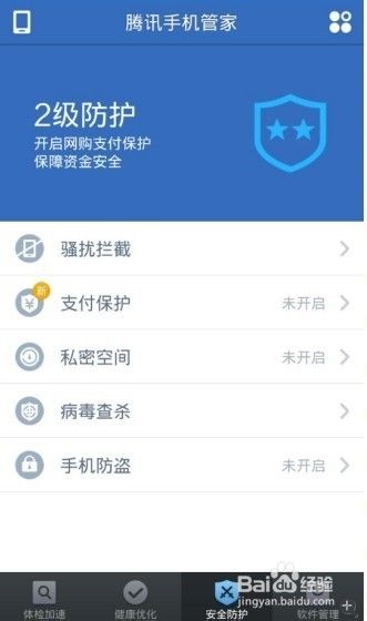 我们可以使用腾讯手机管家帮助我们保护我们的手机支付,首先进入到腾讯手机管家的安全防护页面中。