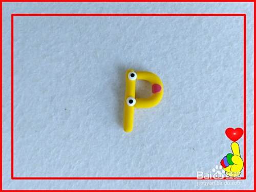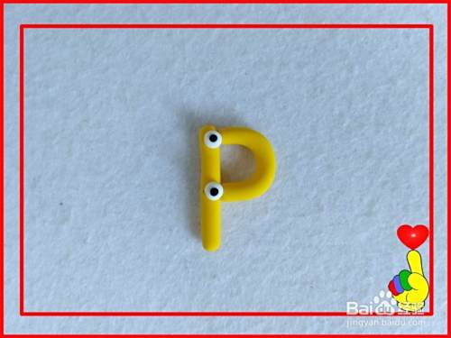 取白色彩泥适量,滚搓成2个小圆球,粘合在字母P上作为“眼睛”。