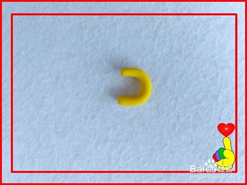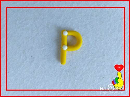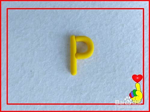 再取金黄色彩泥适量,滚搓细长条,粘合在一起成字母P的形状。