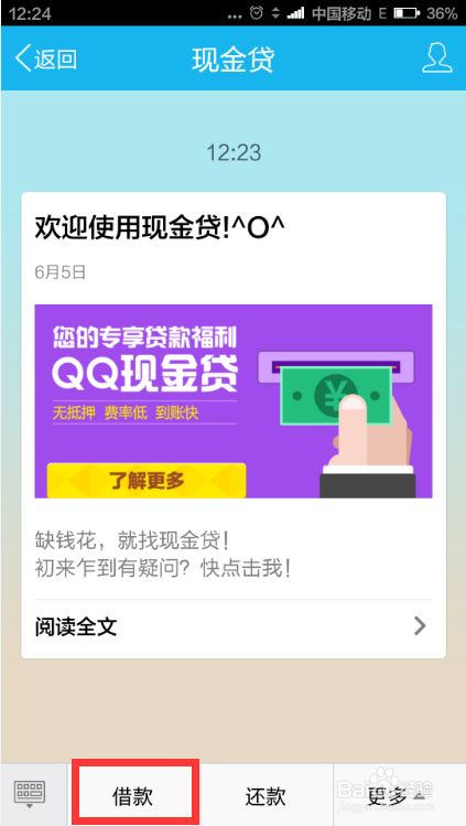 在”现金贷“服务号窗口中,点击”借款”按钮,就可以向“现金贷”申请借款操作啦。