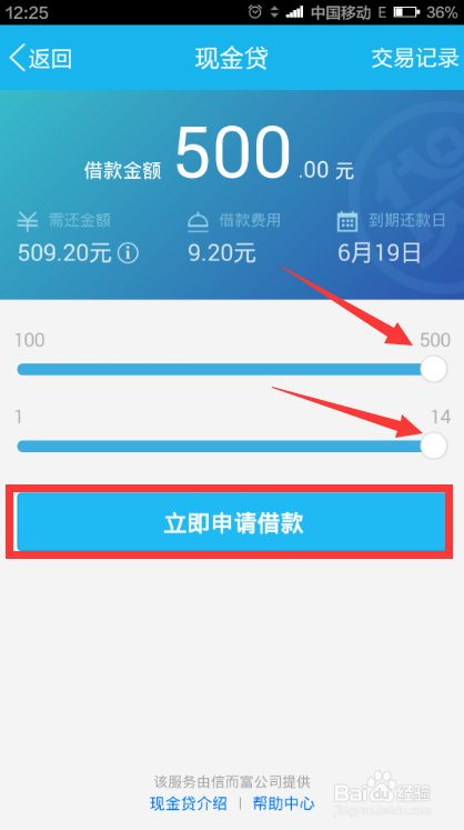 待进入“现金贷”服务号借款界面后,通过滑块调整要借款的数额以及借款日期,点击“立即申请借款”按钮。