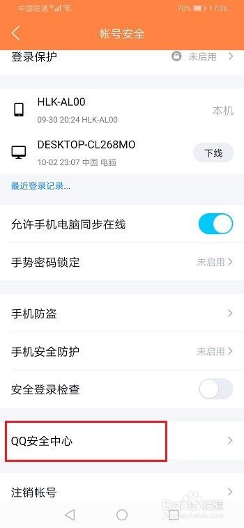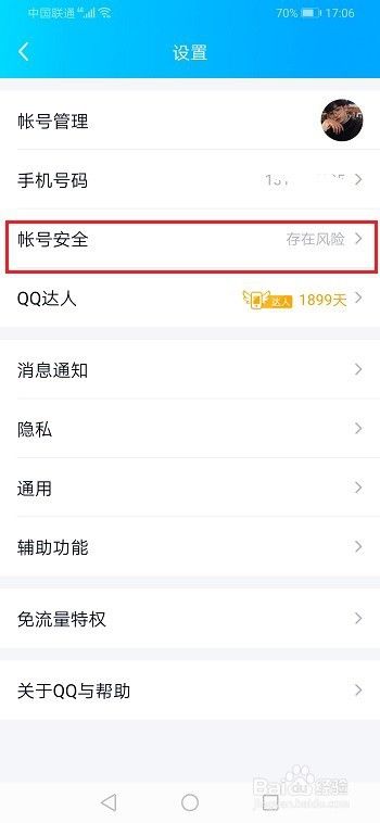 第二步进去qq设置之后,找到账号安全,如下图所示:
