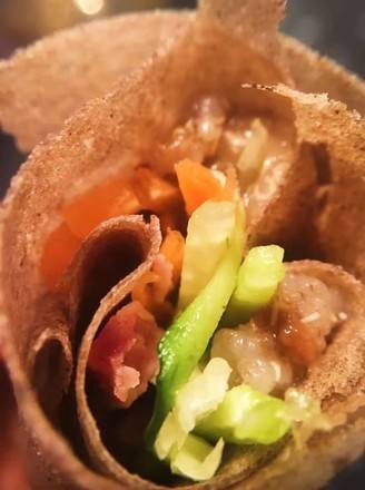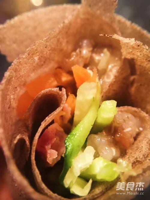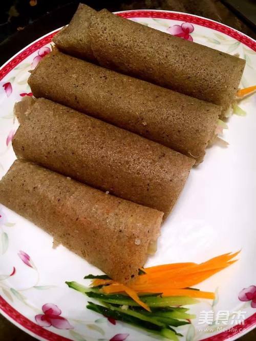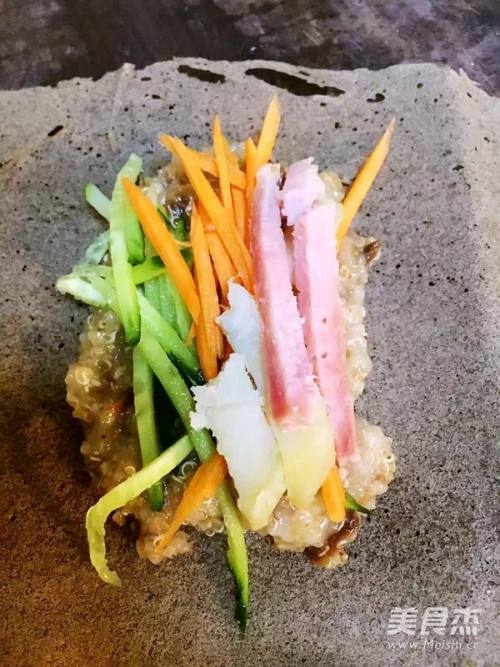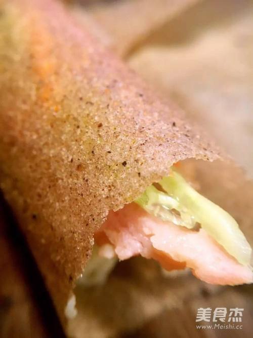55、将所有食材放在黑米煎饼上卷成卷即可;