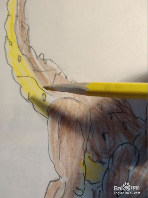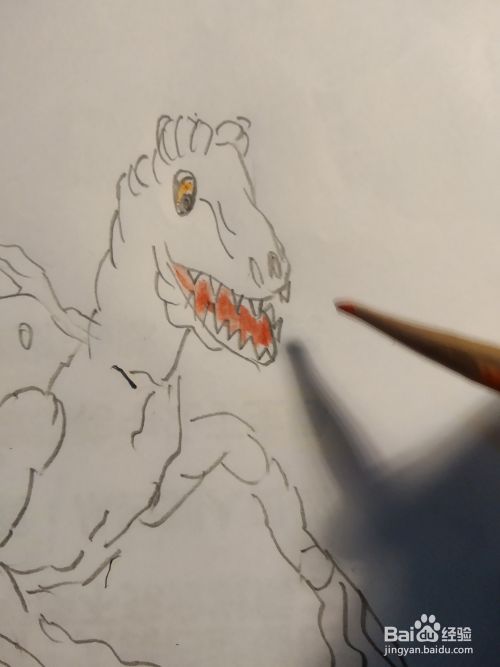 接下来我们用彩铅给画好的恐龙填涂颜色先用大红色粘土他的嘴巴里面,然后用棕色填涂身体,黄色涂身体的腹部和暗部,侏罗纪时代的战龙就画好了,