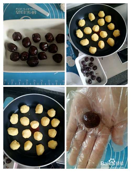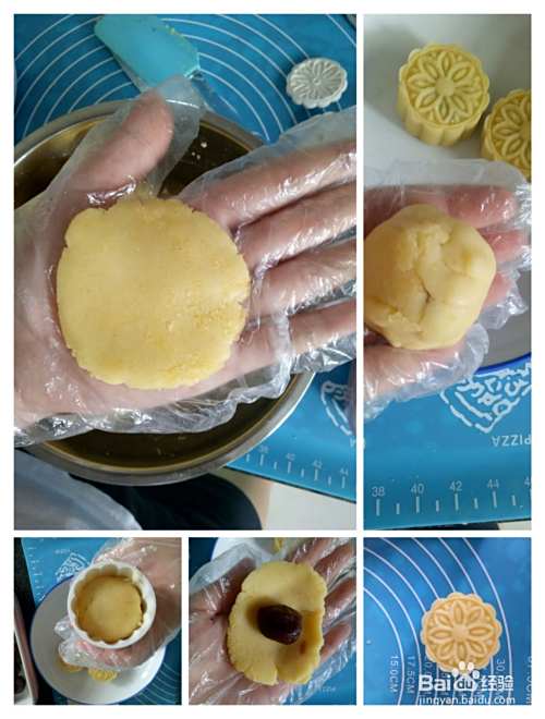 绿豆泥压扁,放入豆沙包好(其实只要包进去搓圆一点就好,不讲究技巧,不用担心,有时候是我们把难度放大而已!然后,放入模具中。