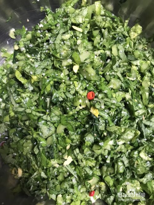 放入大容器加入盐,一般盐和菜比例是不低于10%,不高于40%,用力揉捏拌匀