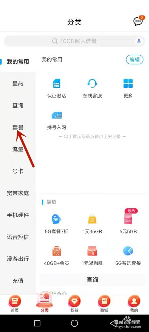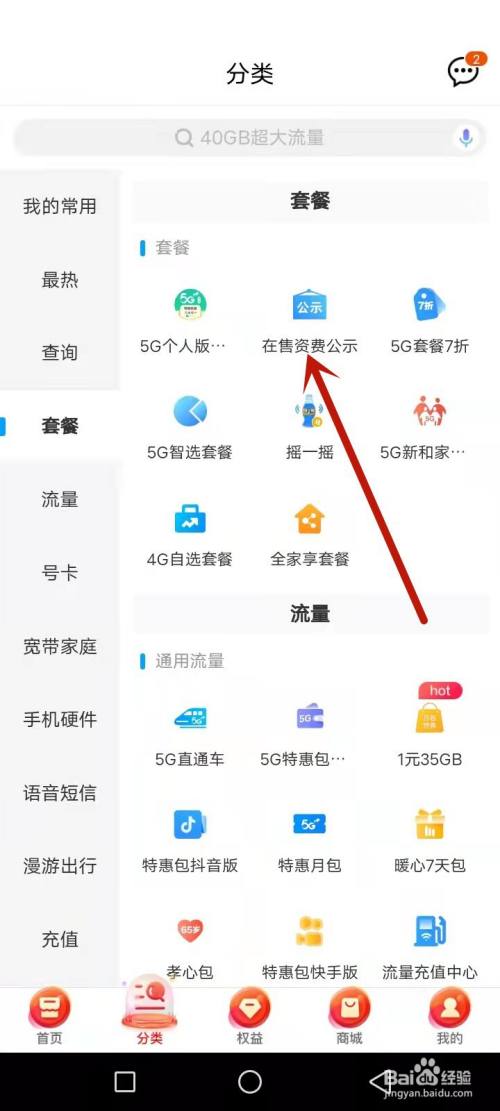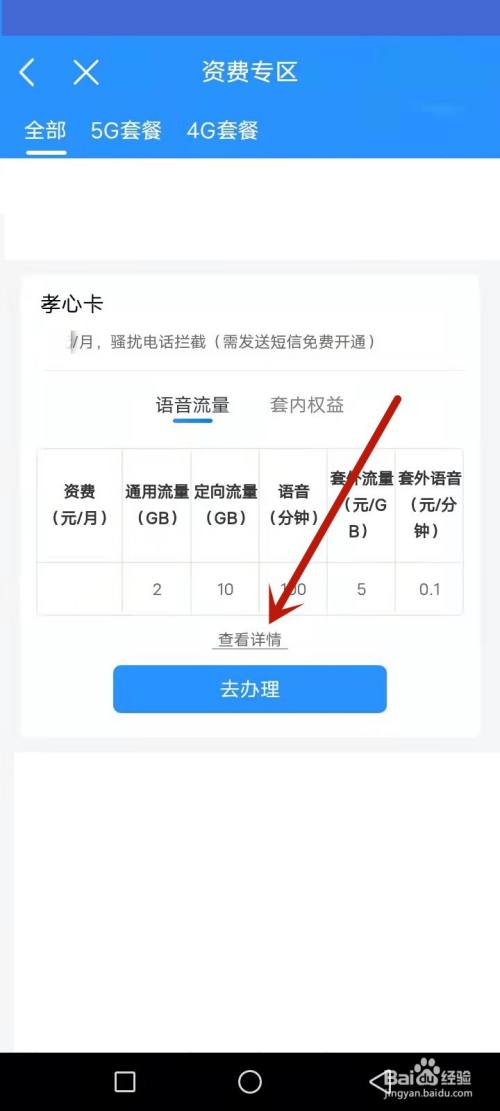 手机打开中国移动软件,分类套餐模块,在售资费公示查看孝心卡项目,包含流量,语音通话和其他权益详情介绍。