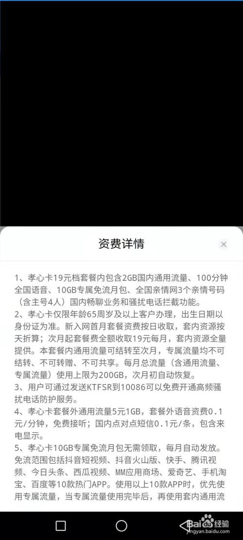 显示移动孝心卡19元套餐详细资费介绍,包含专属流量和通用流量等详情。