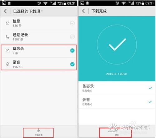选择要恢复的选项,这里是选择备忘录和录音,然后点击页面下方的”开始下载“按钮,下载完成后点击页面下方的”确定“完成下载。