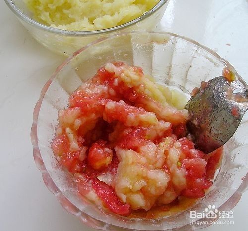 把番茄的汁水用另一只碗装起来,果肉放在土豆泥的碗里,和土豆泥一起加入食盐、 香油、 花椒粉、 黑胡椒粉 、十三香拌匀备用。