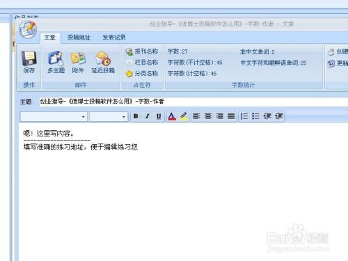 点击新建,将会弹出一个对话框,点击“投稿地址-添加”,把要投稿的地址选着好,然后点击保存。点击“文章”,将主题-内容按照下图填写好保存。然后,点击“发送”即可。