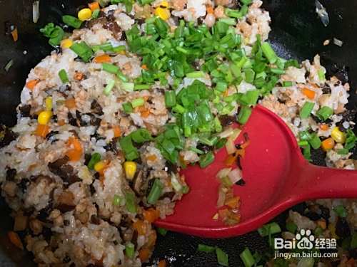 加入调料翻炒,再倒入糯米饭翻拌均匀,倒入葱叶部分再搅拌均匀