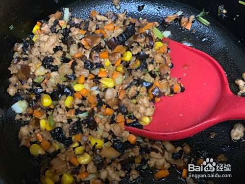 香菇、木耳、胡萝卜切碎,香葱切葱花,葱白和葱叶分开。炒锅倒入适量植物油,油八分热倒入肉末翻炒变色,倒入葱白翻炒,倒入香菇等其他配料