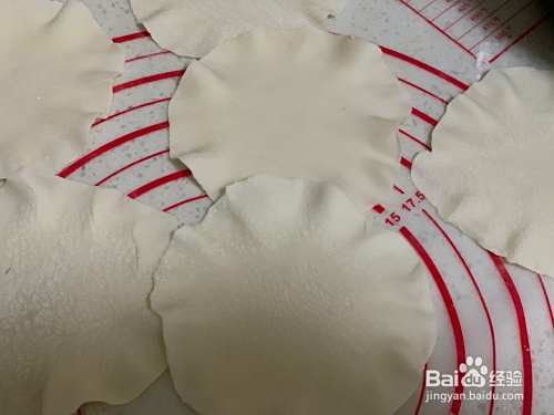 面团可以分成28个(15克/个)剂子,擀面杖擀成比饺子皮略大一点儿,再用擀面杖沿着边沿转圈擀出花边