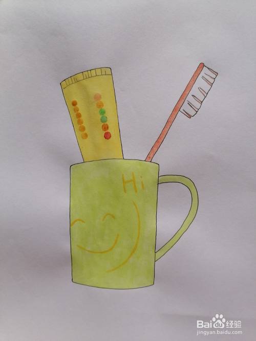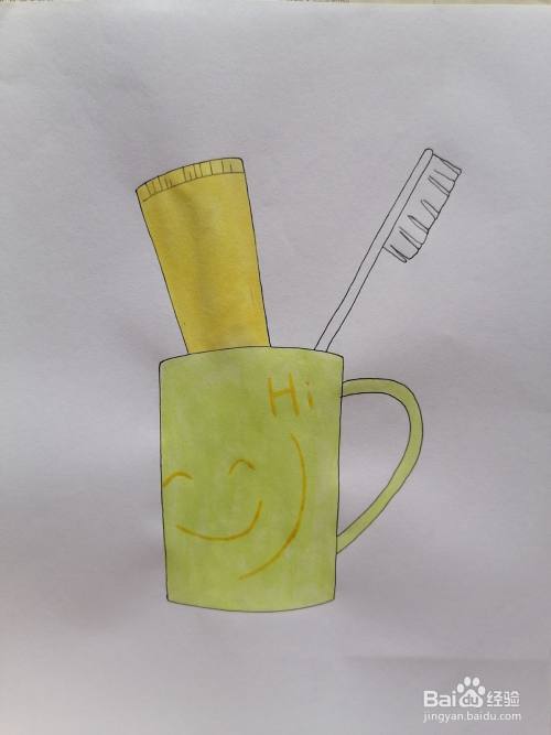 用藤黄水彩在漱口杯上画一个笑脸和涂好牙膏表面