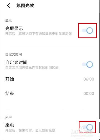 进入氛围光效界面,关闭亮屏显示、来电开关即可。