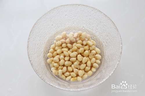 干黄豆洗净加入清水,浸泡5-8小时至豆粒体积涨鼓。