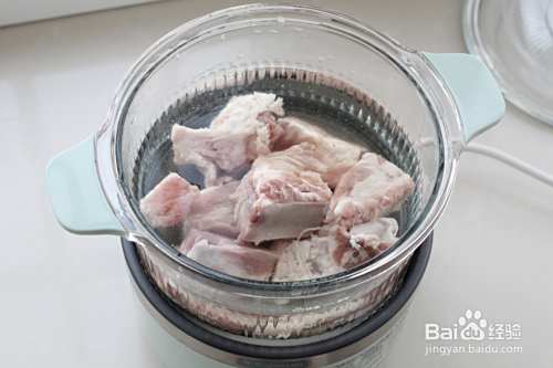 在东菱养生锅内放入洗净的排骨,淋一大勺料酒然后加清水,注意水量不能超过快煮水位线,以免水沸后溢出来。