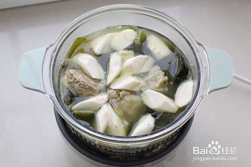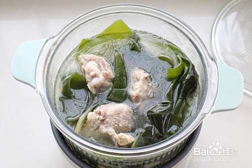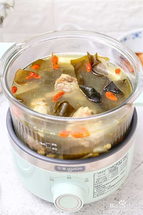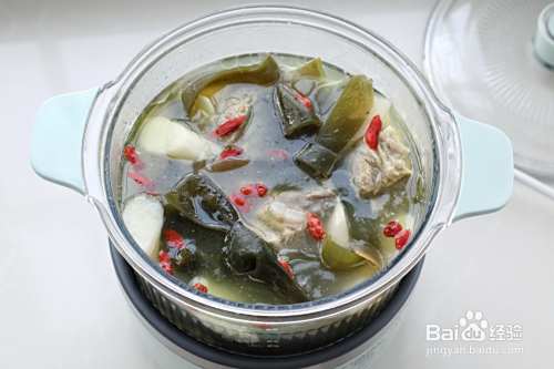 将葱结和姜片捞出丢弃,加入海带结调成慢炖模式煲炖四十分钟。