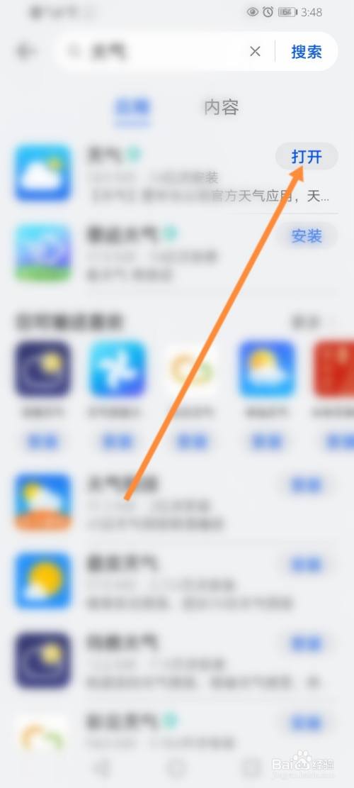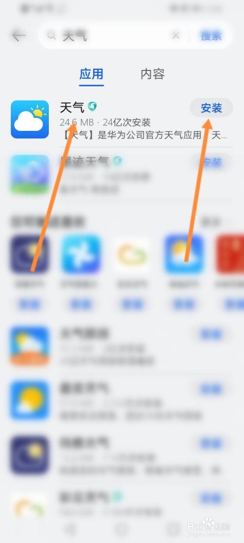 进入华为应用市场,可在天气中,通过点击安装和打开,来恢复自带的天气软件。