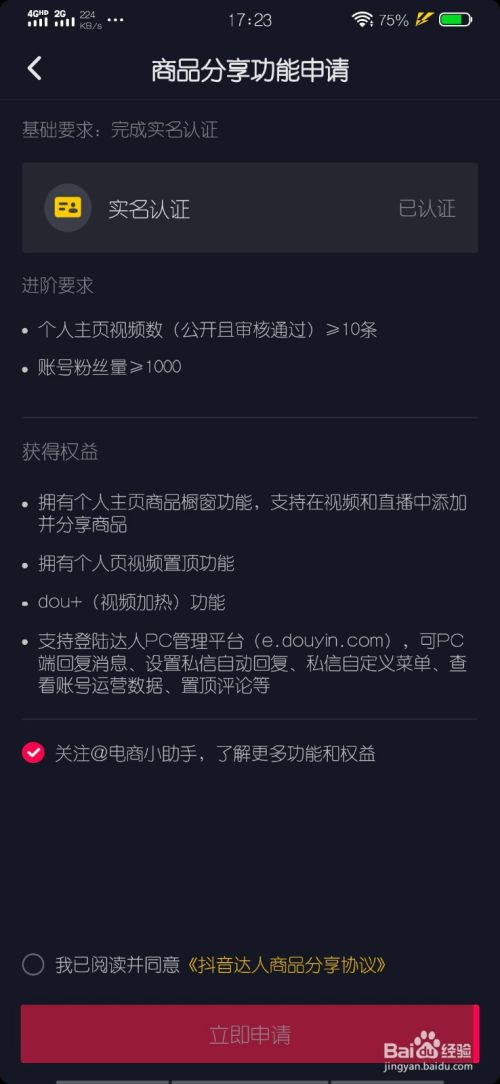 如果以上几条都满足了,我们就可以选择立即申请开启商品橱柜功能,有了该项功能后我们就能在直播和视频中添加淘宝链接啦。