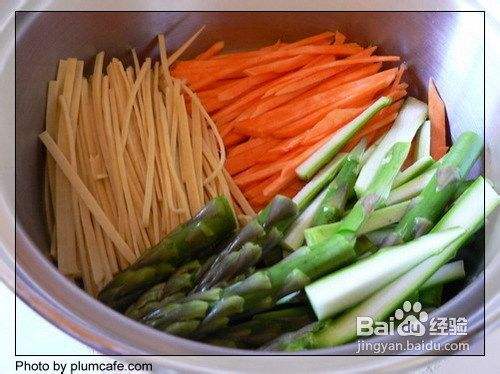 芦笋6枝,去老根,切三段,粗的部位四等分。百叶(豆腐皮,干豆腐)切丝,红薯去皮切丝。一起放在无水烹饪锅里。加一匙水,煮熟。如果没有无水锅的话,也可用普通的煮锅烧开水,把蔬菜和百叶丝分别烫熟。然后,按照喜欢的口味调味道。我调的味道是:花椒油和盐调芦笋,红油和盐调百叶丝,麻油和盐调红薯丝。