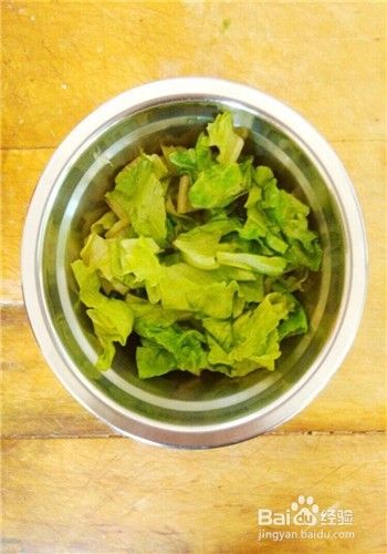 将生菜放在水龙头下冲洗并沥干水分,之后放在案板上,用刀切成小块放入碗中备用。
