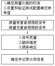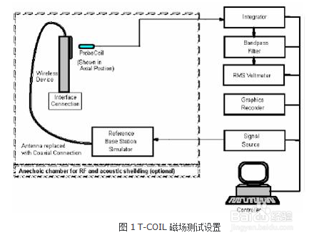 T-Coil测试测量仪器包括以下设备: 1.支持音频输入或输出的基站模拟器/射频通信测试仪 2.探头线圈组件 3.真RMS电压表 4. 1/3倍频程带通滤波器 5.电源 6.赫尔姆霍茨校准线圈 测量方法为:控制无线通讯设备使其处于通话模式下,要求基站模拟器能够向无线通信设备提供模拟的音频信号。基站模拟器控制无线通信设备使其处于最大发射功率状态。这主要是考虑到其在最大功率模式下准确计入其基带部分可能会对听筒中的线圈产生的影响。要注意的是测量时需要用RF线进行链接而不是通过无线方法链接,这主要是为了屏蔽测量过程中射频传输信号对测量结果所造成的影响。 整个测试过程是由以下多级程序完成,首先测量对助听器T-coil有用的音频频段的磁场场强。第二步测量无意信号磁场分量,用以确定来自无线通信设备显示器和电池电流通路等对音频频段有意信号所造成的影响。以下是测量的大致流程: