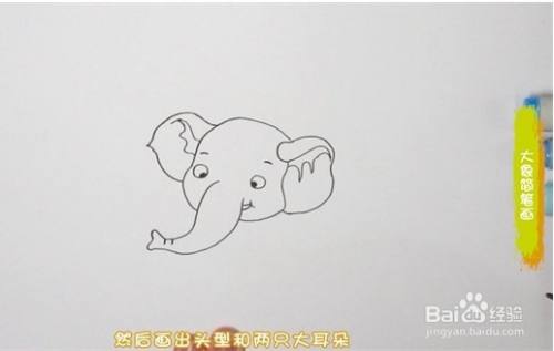 在鼻子旁边画出大象的嘴巴,然后绘出脑袋的轮廓,在脑袋的左右两边画出想扇子一样的大耳朵,,里面再画上内耳廓。