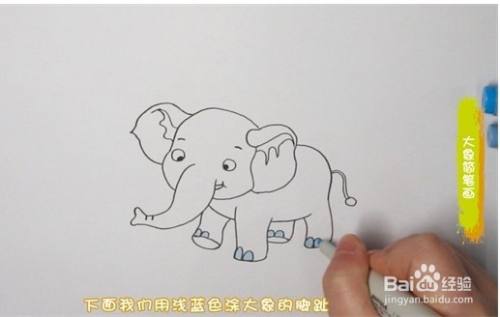 往右边慢慢的画出大象的身体和四肢,注意画出大象脚上的脚趾形状,后面再画上尾巴,接下来用浅蓝色给大象脚趾上色。