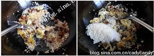 鸡蛋打入锅中,搅碎和其它材料炒匀,加入冷饭,用锅铲拨开饭团,同时保持勤翻动锅中的材料。