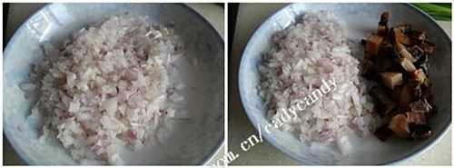将洋葱切成小丁,酱肉也切成小块,葱花切好备用。