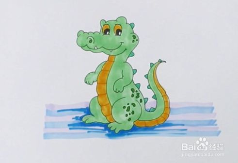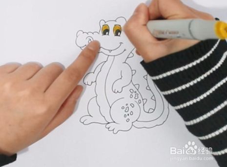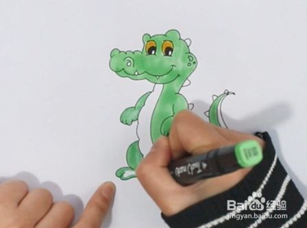 在鳄鱼的背上画上尖刺,并在后肢上画上斑纹,给鳄鱼的眼睛涂上黑色和黄色。