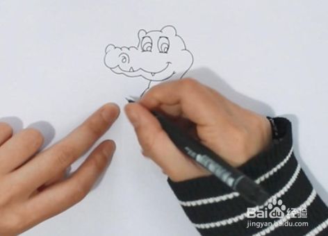 首先画出鳄鱼的头部,它的皮肤是凹凸不平的,眼睛大大的,嘴巴很长。