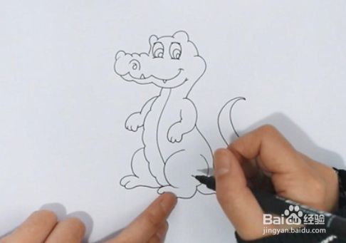 接着画出鳄鱼的身体,两只前肢较短,后肢比较的粗壮,身后画上尾巴。