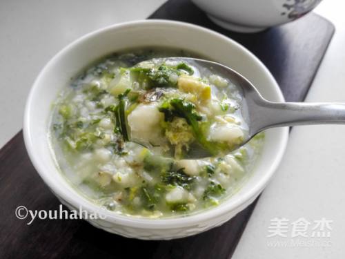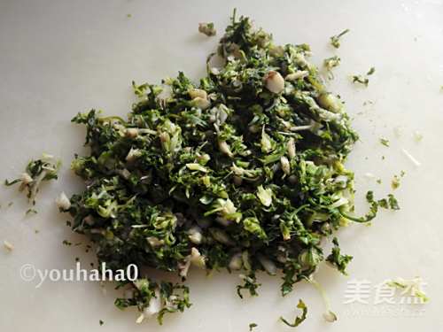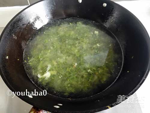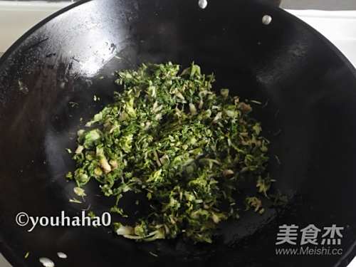 3炒锅放入适量的植物油烧热,放入荠菜碎炒出香味