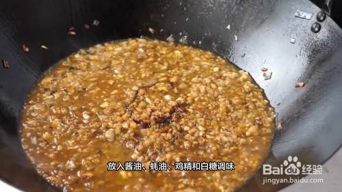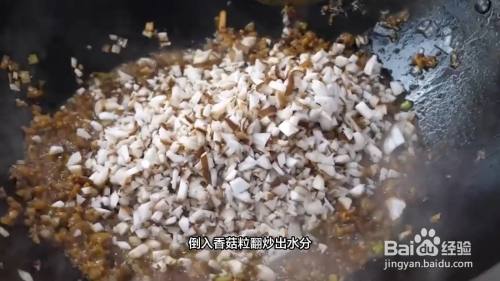 倒入料酒去腥,加入豆瓣酱翻炒上色,倒入香菇粒翻炒出水分。