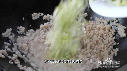 起锅烧油,油热后下猪肉沫炒散炒香,炒香后下入葱姜沫翻炒均匀。