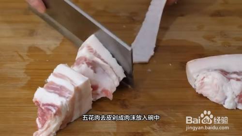 五花肉去皮剁成肉沫放入碗中,香菇切成香菇碎,生姜和大葱切沫。
