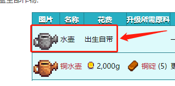水壶是用于浇灌植物.能用任何水装填,或者井.升级水壶可以更改左键的功能,按住左键来增加浇灌面积.浇灌较大的区域花费和你手动一个个浇灌同样的水和耐力。