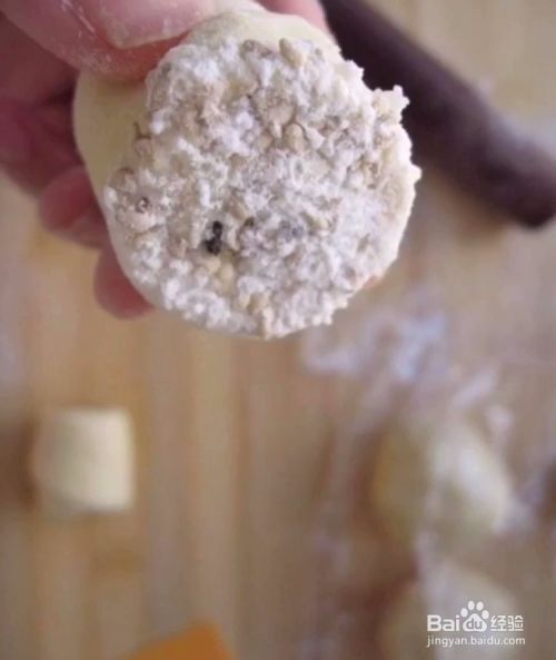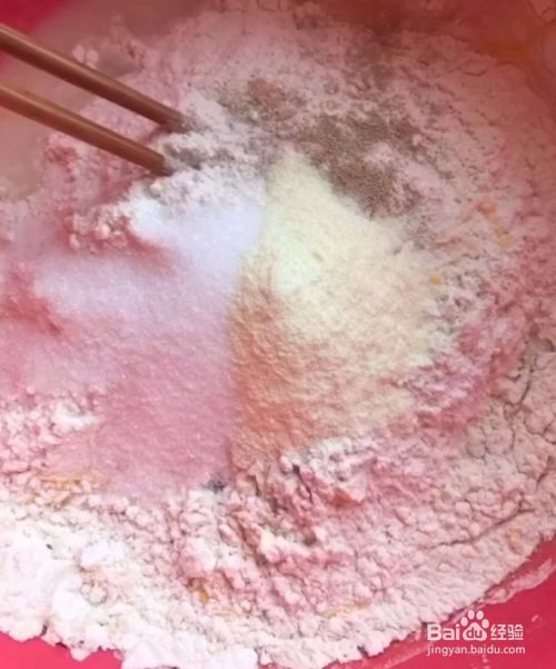 盘中放入面粉,糖,芝麻搅拌均匀作为干料