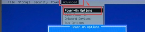 开机按F10进入BIOS,选择“Advanced”->“Power-On Options”,按回车。