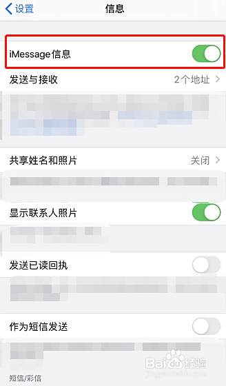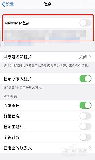 在信息页面中,可观看到〔iMessage〕右边的按钮是打开模式,如图所示: