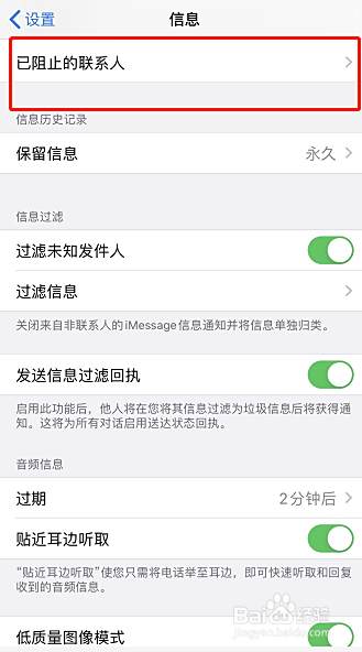 在信息界面,下滑,找到〔已阻止的联系人〕,如图所示: