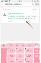 打开微信,在微信上方的搜索框中输入“国家网信办举报中心”,找到公众号并打开。
