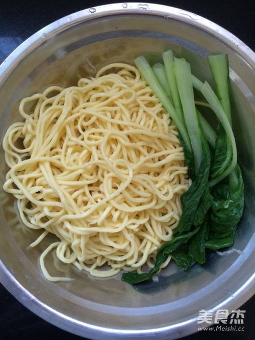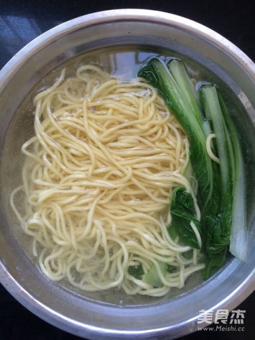 4将煮熟的面条和小白菜捞出,放入凉白开中过凉水