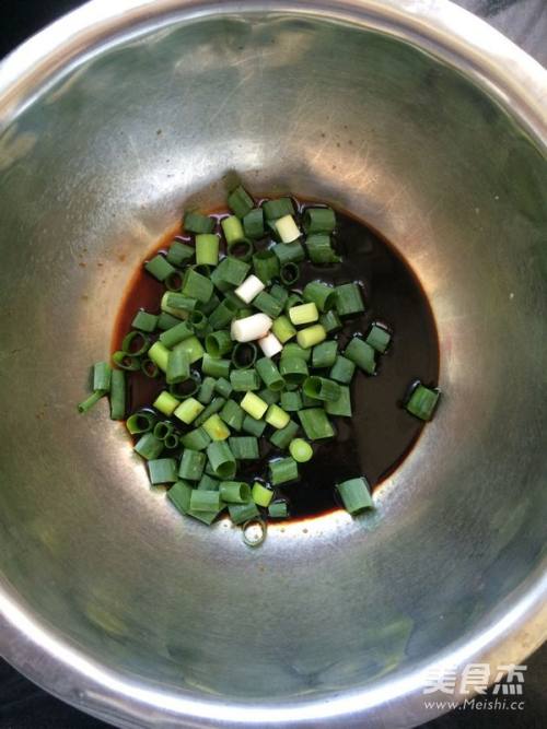 6准备一个小碗放入红油2勺,生抽2勺,老抽1勺,白糖少许,鸡精适量,葱花适量调成料汁。