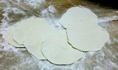 把长条切成小圆形,压扁,用擀面杖擀成圆形的饺子面片。