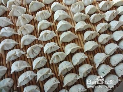面皮上放入适量的菜,把饺子片的四周捏紧。饺子包好后,放到饺子板上。
